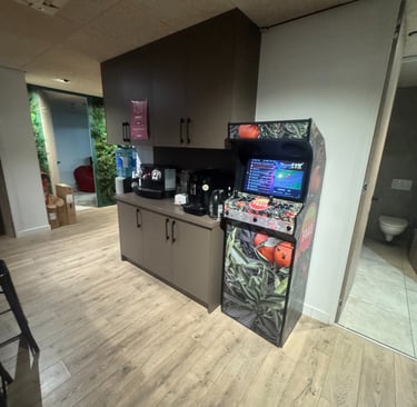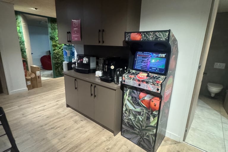 Dans la grande salle de réunion (où l'on a repéré quelques Nerf guns prêts pour la bataille !), la grande table a été nettoyée avec soin pour accueillir les futurs brainstormings sans la moindre trace de poussière ou de doigts.